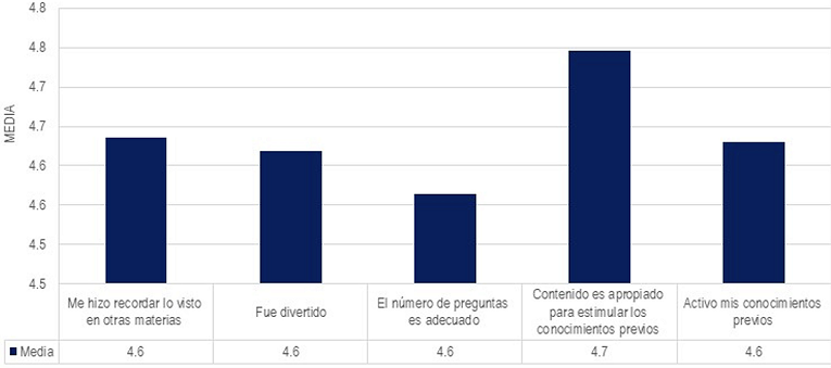 • Aceptación de una actividad lúdica. A través de los ítems: Fue divertido (4.6), Me gustaría que hubiera más actividades lúdicas (4.5).