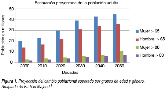 La enfermedad arterial coronaria en la diversidad de sus manifestaciones continúa ocupando uno de los primeros lugares de mortalidad en todo el mundo.1 Los avances médicos han permitido una mayor esperanza de vida y la población muestra un desplazamiento hacia grupos de edad cada vez mayores.2 En el año 2000 la población que rebasaba los 65 años representaba el 12.4% del total; se prevé que para el año 2030 ascenderá al 19.6%, llegando al 21.7% para el 2050.2-3 El grupo de mayores de 80 años se duplicará en el 2030 (7.5% de la población total) y triplicará para el 2050.3 Las mujeres serán el género mayoritario ocupando el 59.0% en aquéllos de más de 65 años, pero implican hasta las dos terceras partes, cuando hablamos de mayores de 80 años (Figura 1). Otro aspecto a considerar es el comportamiento étnico, ya que no sólo es el envejecimiento poblacional sino que éste se presentará en grupos considerados minoritarios.3,4
