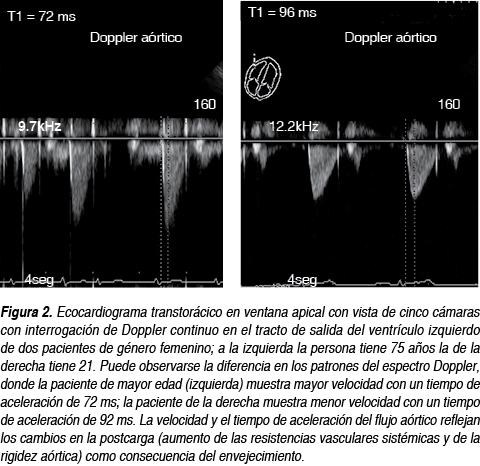 Los vasos arteriales y los tejidos son más rígidos, se encuentran en remodelación -cuya manifestación puede ser también a manera de dilatación o aneurismas-, siendo menos distensibles con flujos turbulentos, lo que lleva a elevación de las resistencias vasculares sistémicas y mayores sitios susceptibles de lesión endotelial.17,18 Hemodinámicamente se refleja con el aumento de la presión sistólica, la presión de pulso y de la velocidad de la onda pulso en todo el árbol arterial. La repercusión ventricular se caracteriza por incremento de su masa, hipertrofia concéntrica y grados variables de disfunción diastólica.19,20 Si se suma la calcificación del anillo mitro-aórtico, la elevación de las resistencias vasculares sistémicas ante un árbol arterial rígido, como una consecuencia se eleva la postcarga (Figura 2), la cual prolonga el tiempo de contracción ventricular además de afectar la relajación, lo que rompe el balance entre aporte y demanda de oxígeno, predisponiendo a la isquemia.17-21