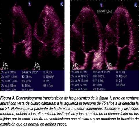 Las alteraciones en el llenado ventricular o disfunción diastólica afectan los volúmenes diastólicos finales que bajan hasta en una tercera parte en la población de más de 80 años (Figura 3). La afección lusitrópica (e inflamatoria) distienden la cavidad auricular izquierda, predisponiendo -y explicando- la mayor incidencia de fibrilación auricular en grupos seniles. La fibrilación auricular compromete el gasto cardiaco (en un 20.0%), el cual ya de por sí está disminuido, pues es sabido que tiene un descenso a razón del 1.0% anual a partir de los 30 años.21,22