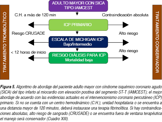 El ICP primario es un recurso de escasa disposición que requiere de centros especializados con un tiempo de realización máximo de 120 minutos y preferentemente menor a una hora.35,36 Las excelentes tasas de resultados en el adulto mayor posicionan al ICP primario como la estrategia de elección para este grupo de edad; la mortalidad a 30 días con ICP primario es del 9.0% comparado con el 29.0% de los manejados con trombólisis.1 El seguimiento a un año mostro que el 13.0% de los pacientes con ICP primario presentaban complicaciones o recurrencia mientras que esto acontecía en el 44.0% de los manejados con trombólisis (estudios C-PORT, AIR. DAMI, DANAMI, PRAGNE-2).52,53,54 Los pacientes con choque cardiogénico el ICP tiene una indicación clase IIa para pacientes mayores de 75 años cuando no se ha logrado la estabilización en las primeras 18 horas.4,5,36
