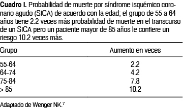 Los síndromes isquémicos coronarios agudos (SICA) son la principal causa de muerte en los mayores de 65 años, pero les confiere el mayor grado de comorbilidad y complejidad para su abordaje diagnóstico y terapéutico.6,7 El 26.0% del total de muertes en Estados Unidos en el 2006 fueron de causa cardiovascular,8 para el 2007 se elevó al 33.6%. En mayores de 65 años la mortalidad cardiovascular acontece en el 86.0% de los casos; el 85.0% de las hospitalizaciones se deben a cardiopatía, documentándose el infarto al miocardio en el 62.0% de las veces y en el 77.0%. El reporte diagnóstico implica a la insuficiencia cardiaca.9,10 Aunque existen algunos lineamientos específicos para este grupo de edad, no había la experiencia ni la evidencia suficiente para su atención; éste sólo se transpolaba y sistematizaba, ya que el paciente senil era excluido de los grandes estudios.4,5