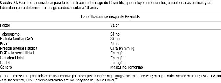 Considerando que la edad es el principal factor de riesgo en el paciente adulto mayor, todos los pacientes deberían contar con cálculo del riesgo cardiovascular. Existen múltiples escalas de riesgo que permiten estimar la probabilidad de un evento cardiaco a 10 años; todas vigentes y plenamente validadas.1,4,6,19,34,35,36 Es lógico pensar que el médico debe utilizar aquélla con la que se encuentre más familiarizada o la que mejor se apegue a los recursos y características de su entorno laboral. La escala de riesgo Reynolds se recomienda en el grupo de mayores de 65 años; ésta incluye la edad, género, cifras de presión arterial sistólica, tabaquismo, antecedente familiar de EAC a edades tempranas, colesterol total, colesterol de alta densidad y proteína C reactiva.36,37 El resultado es expresado en porcentaje y se estima el riesgo en bajo (menor a 5.0%), intermedio (5.0 a 10.0%) y alto (mayor de 10.0%) para riesgo de EVC, EAC, muerte e infarto a 10 años (Cuadro XI). Guarda una adecuada correlación clínica e incluye marcadores inflamatorios como la PCR, diferencia entre el colesterol total y el de alta densidad. Si bien no considera al paciente diabético, se sabe que este grupo es de entrada ya de alto riesgo.1