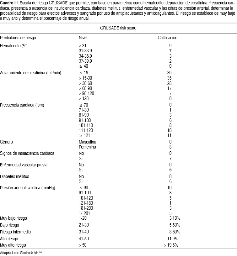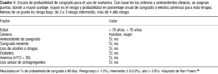 Los anticoagulantes orales del tipo de la warfarina tienen un papel reducido en pacientes con SICA a menos que existan condiciones patológicas específicas (por ejemplo, la ectasia coronaria); tienen una indicación importante en el caso de trombosis venosa profunda, embolismo pulmonar, fibrilación auricular, eventos vasculares cerebrales y la presencia de prótesis valvulares por mencionar algunos.34,35,40 El grupo de edad mayor de 75 años muestra un incremento en el riesgo de sangrado cuando se decide esta estrategia terapéutica, por ello se requiere de una adecuada selección de los casos y para ello se cuenta con herramientas que permiten establecer en primer el lugar el riesgo embólico de cada paciente: escala CHADS, CHADS2, CCS-SAF y CHADS2Vasc (Cuadro IV).47,48 Así mismo, es recomendable combinar la necesidad de manejo anticoagulante con el riesgo de sangrado mediante el uso de aplicaciones como la warfarina bleeding risk (Cuadro V), OAC bleeding risk, HAS BLED score, warfarina OBRI y/o el CRUSADE.47,49,50