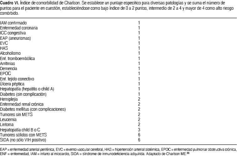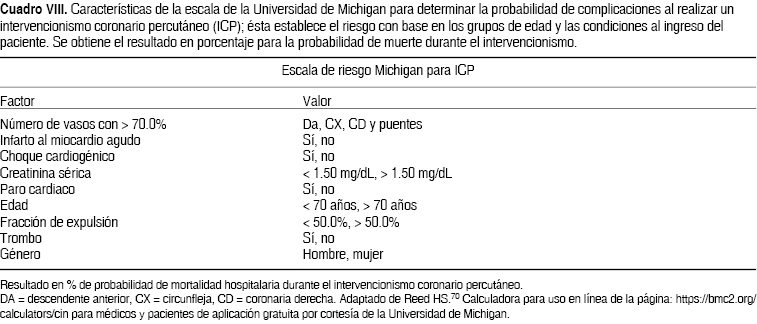 Considerando la AI y IAMSST el estudio RITA-3 demostró una menor mortalidad a los cuatro meses con estrategia invasiva temprana basada en ICP.36 El FRISCII la estrategia invasiva temprana con ICP puso de manifiesto que la mortalidad a seis meses era menor con un 9.40% comparado con el manejo conservador 12.0%.36,40 El TACTICS-TIMI18 arrojó resultados similares en favor de estrategia invasiva temprana con ICP.54,55 En contraparte el análisis VANQWISH no encontró diferencias en ambas estrategias en un seguimiento a dos años. Las guías de manejo recomiendan la realización de una estrategia invasiva temprana en pacientes con alto riesgo o con isquemia moderada a severa demostrada.36,56 En el 2012 se presentaron los resultados del estudio ELDERLY ACS TRIAL que agrupó a pacientes mayores de 75 años con SICA del tipo IAMSST (13,580 pacientes) que se distribuyeron para recibir una estrategia invasiva temprana o tratamiento conservador; los puntos primarios fueron muerte, IAM, EVC, hospitalización y sangrado para un seguimiento de 12 meses.57,58 En el grupo de manejo invasivo temprano el punto primario aconteció en el 27.9% de los casos mientras que el grupo control las complicaciones fueron del 34.6%. A pesar de ello los autores concluyen que no es posible definir y recomendar por completo una estrategia invasiva temprana en este grupo de edad, pero que un marcador para optar por este tipo de manejo sería la elevación de troponinas.59 Un reporte español de pacientes con SICA del tipo IAMSST en mayores de 85 años en quienes se realizó una estrategia invasiva temprana (100 pacientes) se cotejó con tratamiento conservador (128 casos); se encontró que a tres años existía mayor tasa de supervivencia con un periodo más prolongado libre de isquemia en los pacientes con ICP. Pero fueron excluidos los pacientes con daño renal, índice de CHARLSON (Cuadro VI) mayor de tres y aquellos que no tenían elevación de troponinas.52