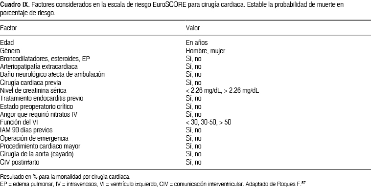 El manejo mediante ICP o quirúrgico en el adulto mayor presenta mayores complicaciones debido a la necesidad de mayor tiempo de soporte ventilatorio, prolongación del apoyo circulatorio, tasas de sangrado elevadas, fallo renal agudo, daño cognitivo, infección, necesidad de reintervención y desarrollo de fibrilación auricular.1 Se cuentan con algunas escalas de riesgo como se puede observar en los cuadros VII, VIII y IX, los cuales son una herramienta para poder determinar si la terapia elegida es factible de realizar en el adulto mayor y que permita además minimizar los riesgo y complicaciones o al menos establecer manejos y cuidados preventivos. En el caso de optar por un manejo quirúrgico es preferible la cirugía de mínima invasión en este grupo de pacientes. En mayores de 80 años los estudios no muestran una diferencia significativa entre la estrategia conservadora y la estrategia invasiva temprana mediante IDAC.34,36