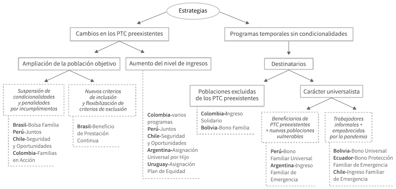 Si bien los países del subcontinente han venido implementando PTC de características similares desde finales de los años noventa, en los países con mayor incidencia de la pobreza estos programas han adquirido mayor institucionalidad y, por consiguiente, desarrollado importantes capacidades institucionales para distribuir de manera más eficiente las transferencias de ingresos entre la población necesitada. Esto permitió una mayor utilización de estos recursos institucionales para hacer frente a la pandemia de Covid-19.
