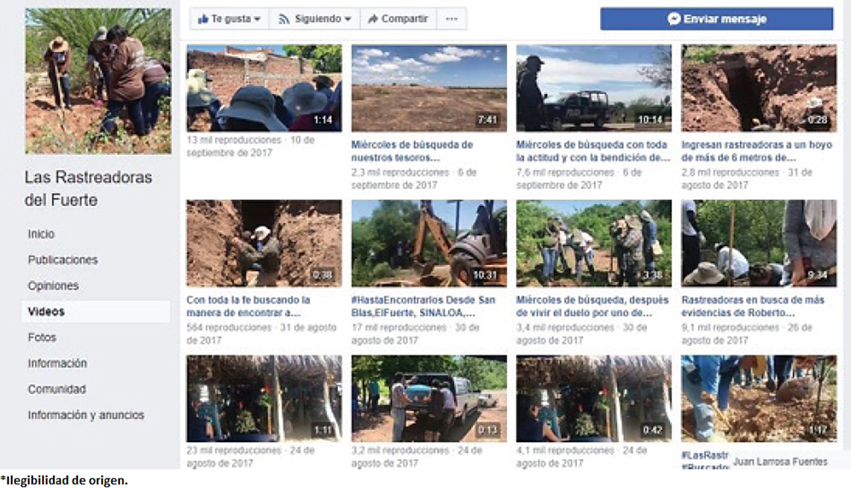 El perfil de Facebook de Las Rastreadoras del Fuerte contiene en un archivo 31 videos que fueron grabados en tiempo real durante alguna de las búsquedas de campo que han realizado. En promedio, cada video tiene entre 6 000 y 7 000 reproducciones, y alrededor 200 y 300 comentarios. La mayor parte se concentran en solicitar información sobre las características físicas o rasgos distintivos de los tesoros que son localizados, así como del detalle que pudieran tener las ropas que fueron localizadas junto con ellos. Algunos comentarios sucedían en tiempo real durante las trasmisiones; sin embargo, muchos ocurrían a días de haber realizado la búsqueda en campo.