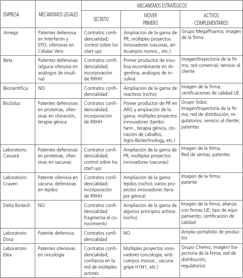 Analizando por cada mecanismo, se puede apreciar que la mayoría de las empresas utiliza mecanismos legales, principalmente la patente, aunque se observan dos situaciones distintas en lo relativo a su carácter: hay patentes “defensivas” y “ofensivas”. Las primeras protegen innovaciones puntuales en nichos de conocimiento que han quedado vacantes. Suele ser el caso de patentes sobre innovaciones de proceso, que la firma solicita para proteger los procedimientos con los que trabaja y, de ese modo, evitar que terceras empresas la demanden por copia y detengan su actividad productiva. Tales patentes suelen tener por único titular a la firma y se pueden observar en el caso de las proteínas recombinantes biosimilares (Biosidus, Amega, Beta y Dosa) o en las patentes que Craveri tiene intención de solicitar en el ámbito de los tejidos. El segundo caso, las patentes “ofensivas”, se presenta cuando las innovaciones alcanzan mayor envergadura y el patentamiento persigue el objetivo de evitar la copia y proteger una innovación potencialmente rentable en el mercado. Dichas patentes pueden observarse en Biosidus, para el tambo farmacéutico y la terapia génica, y en distintos proyectos inherentes a vacunas, como en los casos de Elea, Craveri, Amega y Cassará. En estos casos puede haber cotitularidad público-privada o titularidad exclusivamente pública de la patente, aunque en este último caso la parte pública suele ceder en licencia exclusiva la explotación comercial de la patente a la parte privada, a cambio de regalías sobre ventas futuras.