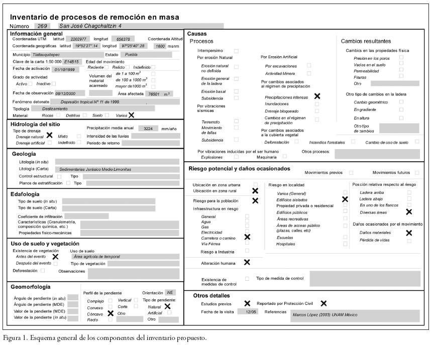 Con base en la revisión detallada de otros inventarios (Ibsen and Brundsen, 1995; Alger and Brabb 2001; Dellow et al., 2003; Wegmann, 2005; US Geologycal Survey Data Base), de los reportes elaborados por el grupo de trabajo del inventario mundial de movimientos de ladera de la UNESCO (WP/WLI, 1990, 1991, 1993a, 1993b, 1994) y del tipo de información asequible en México, se definió la estructura del inventario. Ésta comprende ocho categorías: información general, hidrología, geología, edafología, geomorfología, causas, riesgo y otros detalles. Cada categoría contiene sus respectivos campos y variables, algunos de los cuales se estandarizaron a la simple opción "si o no", en tanto que otros se dejaron abiertos, dependiendo de las circunstancias particulares (Figura 1).