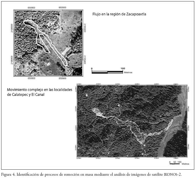 Con base en el análisis visual de las imágenes IKONOS, se identificaron los procesos de remoción en masa de la zona. Este tipo de imágenes posee la bondad de tener una gran resolución espacial y radiométrica. Su cubrimiento es de 13 x 13 km y el tamaño de píxel es de 0.8 m en pancromático y 3.2 m en imágenes multiespectrales; la resolución radiométrica es de 2 048 tonos de gris. Todas estas características se traducen en un detalle significativo de la imagen, ideal para delimitar los movimientos de ladera. Las imágenes se adquirieron georreferenciadas y corregidas, con fecha de toma del 8 al 14 de diciembre del 2000, días registrados con nubosidad cercana a cero, algo que no es muy común en la zona en estudio.