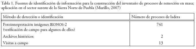 En este apartado se expone un resumen de los datos obtenidos para el inventario de procesos de remoción en masa del sector sureste de la Sierra Norte de Puebla. Es importante señalar que la fuente de un alto porcentaje de movimientos se concentró en el análisis de las imágenes de satélite IKONOS–2, en tanto que las visitas de campo en gran medida proporcionaron información complementaria (Tabla 1).