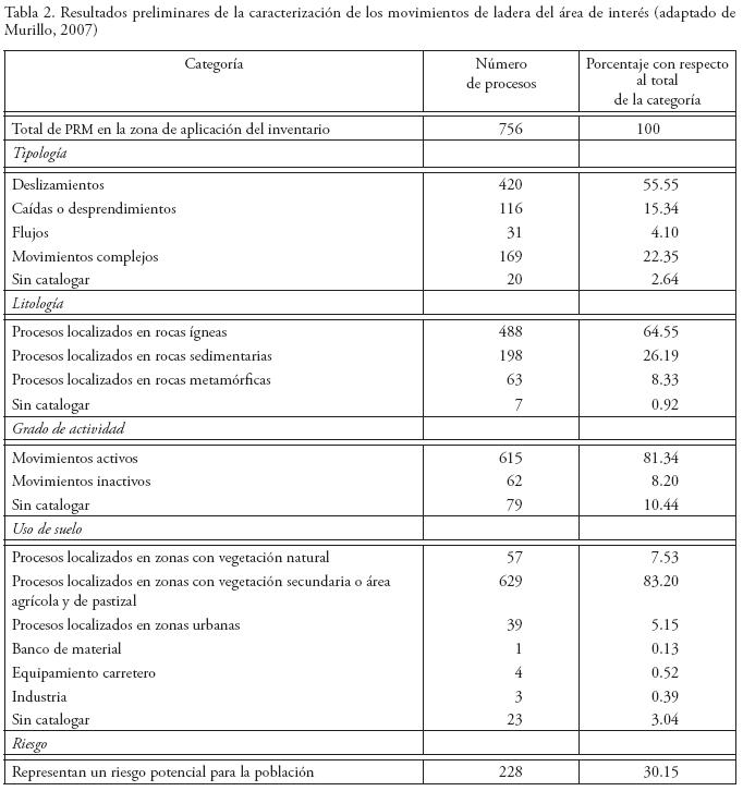 Un total de 756 procesos de remoción en masa fueron registrados. De éste, el 55% correspondió a deslizamientos, 22% a movimientos complejos, 15% a caídas y 4% a flujos. Prácticamente el 65% de los movimientos ocurrió en materiales ígneos, en tanto que el 26% en rocas sedimentarias y el 8% en metamórficas. En relación con el grado de actividad, 81% de los movimientos registrados son activos, 8% inactivos y 10% no pudieron ser catalogados. En función del uso del suelo, la mayor parte de los movimientos, es decir el 83%, ocurrió en zonas con vegetación secundaria o áreas agrícolas y de pastizal. Esta cifra contrasta con el 7.53% de los procesos identificados en regiones con vegetación natural. Asimismo, es importante señalar que cerca de uno de cada tres movimientos registrados representa un riesgo potencial para algún núcleo de población de la región (Tabla 2).