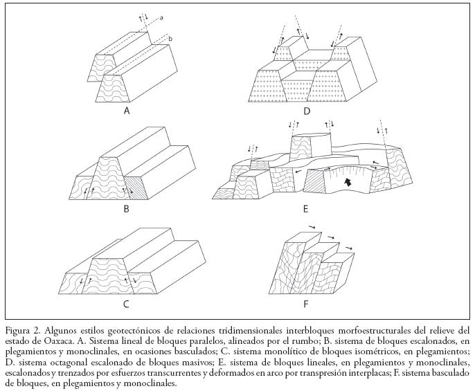 Para designar los estilos morfotectónicos, se estudió el desarrollo de las morfoestructuras y de algunos elementos estructurales en las direcciones transversal y longitudinal de los cuerpos morfotectónicos, su configuración planimétrica, el comportamiento altitudinal de las superficies de planación y las alturas relativas entre los bloques. Como resultado de este análisis se revelaron los estilos morfotectónicos tridimensionales siguientes: sistema lineal de bloques paralelos alineados por el rumbo (extremo occidental del Cerro Yucuiña, en la divisoria meridional de la cuenca Mixteca); sistema de bloques escalonados, en plegamientos y monoclinales, en ocasiones basculados (cerros El Venado y Chucunu, en la Sierra de Coicoyan; cerros Yucuño y Tinduhitun, en la Sierra de Tlaxiaco; y el Cerro El Guayabal, en la Sierra Peñoles); sistema monolítico de bloques isométricos, en plegamientos (en la Sierra de Juárez); sistema ortogonal escalonado de bloques masivos, en margen continental (cerros Conejo, Madrono, Muchacho, Coache, al este de la Sierra de Miahuatlán); sistema de bloques lineales, en plegamientos y monoclinales, escalonados y trenzados, por transcurrencias, y deformados en arco por transpresión interplacas CocosNorteamericana (premontañas y montañas de la Sierra Atravesada, Istmo de Tehuantepec); sistema basculado de bloques, en plegamientos y monoclinales (Cerro de Maíz, Sierra Mixe; Figura 2).
