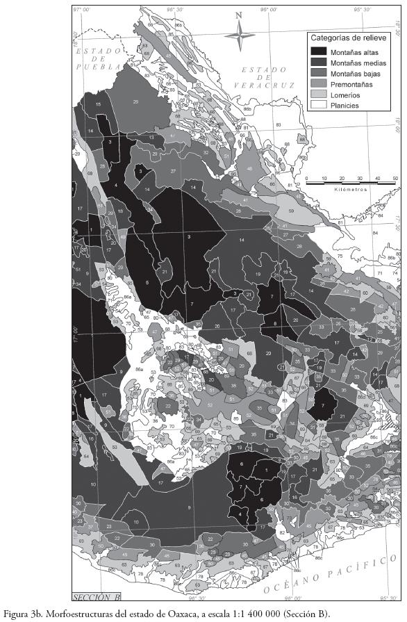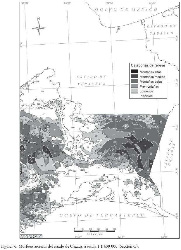 Los seis niveles jerárquicos de clasificación morfoestructural, fundamentados y aplicados al territorio de estudio, permitieron la identificación e integración de las diferentes unidades tipológicas sobre una base de sistematización de la información geológicogeomorfológica y de los datos del reconocimiento de campo.Figura 3a, b y c. Clasificación morfoestructural del relieve del estado de Oaxaca: