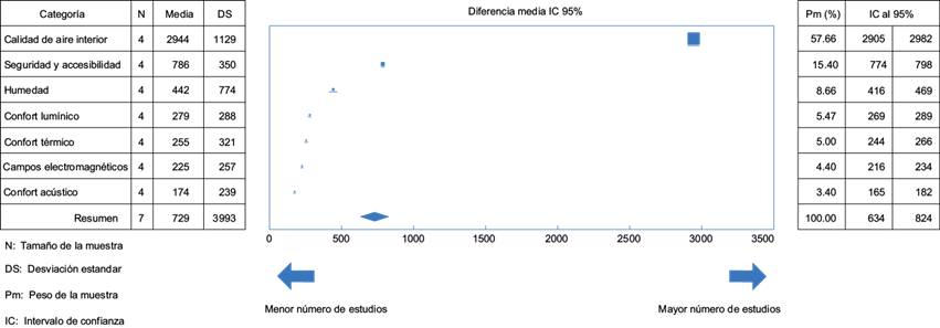 En el metaanálisis de la figura 2 se muestra el resumen de las cuatro bases de datos, siendo la categoría calidad del aire interior la de mayor peso y mayor porcentaje promedio (57.66 %), con una diferencia media muy superior a la del resto de muestras. La categoría seguridad y accesibilidad se encuentra en segundo orden con un porcentaje promedio de 15.40 %; siguen los estudios de la categoría humedad con un porcentaje de casi la mitad del anterior (8.66 %), los de la categoría confort lumínico (5.47 %), y último los de la categoría confort térmico con un porcentaje promedio muy cercano al 5 %. Las últimas dos categorías se refieren a campos electromagnéticos (4.40 %) y confort acústico (3.40 %), que es la muestra con menores investigaciones.