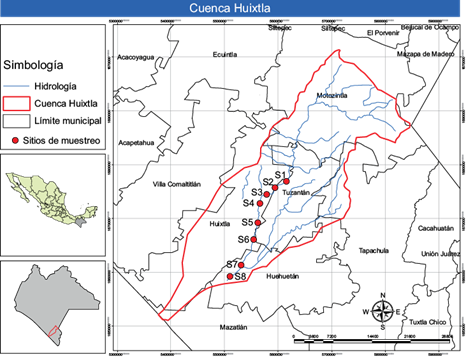 En la parte baja de la cuenca del río Huixtla se ubicaron ocho sitios de muestreo (Fig. 1), basados en la cercanía a zonas donde predominan las actividades agrícolas y ganaderas, e incluyendo a la cabecera municipal de Huixtla que es la comunidad con mayor cantidad de población en esta zona de la cuenca (53 245 hab.; INEGI 2020).