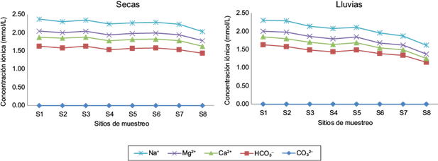 La concentración iónica del agua por sitios y temporadas se muestra en la figura 2 y en el cuadro II dónde se observa que los valores más elevados se presentaron durante el período seco y que disminuyeron significativamente durante las lluvias.