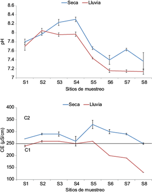La conductividad eléctrica (CE) disminuyó entre temporadas (Cuadro I); de manera general disminuyó en la temporada de lluvias para todos los sitios muestreados excepto en el sitio S1. En la temporada seca el valor mayor se presentó en el sitio S5 (330 µS/cm) y el menor fue en el sitio S1 (240 µS/cm); para las lluvias el resultado más elevado fue en el sitio S1 (270 µS/cm) y el menor fue en el sitio S8 (130 µS/cm).