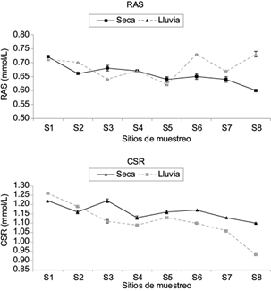 En la figura 4, se muestran los resultados de la RAS y el CSR. Con relación a la RAS el agua fue clasificada como baja en sodio (S1, según Richards 1990), en todos los sitios de muestreo tanto en la temporada de lluvias como en la seca. La comparación de los valores de la RAS entre temporadas indicó diferencias significativas (F = 4.90, DF = 1, p < 0.05).