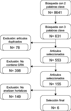 Se realizó una revisión crítica de los artículos y fueron excluidos aquellos que no contenían información sobre GRA en hortalizas enmendadas con estiércol de cerdo y aquellos artículos de segunda fuente (revisiones). Con base en estos filtros (Fig. 1), se realizó el análisis sobre la base de seis artículos en particular.