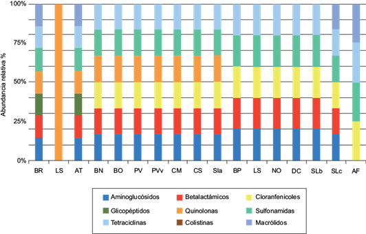 Por su parte, los GRA encontrados en las especies precedentes se asociaron a las siguientes familias de antibióticos: aminoglucósidos, betalactámicos, fenicoles, glicopéptidos, quinolonas, sulfonamidas, tetraciclinas, colistinas y macrólidos (Fig. 2).