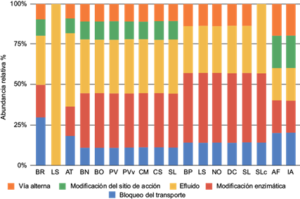 En efecto, la expulsión por bombas de efluido es el mecanismo de resistencia común presente entre todos los genes de resistencia encontrados (Fig. 3). Además, el bloqueo de transporte, producción de vías alternas y la modificación enzimática son los otros mecanismos identificados, siendo este último el que se encuentra representado en la mayoría de los cultivos. Cabe destacar que los GRA detectados en Lactuca sativa (LS) presentan un único mecanismo de resistencia, mientras que en los otros cultivos, se detectaron GRA con cuatro o más mecanismos de resistencia.