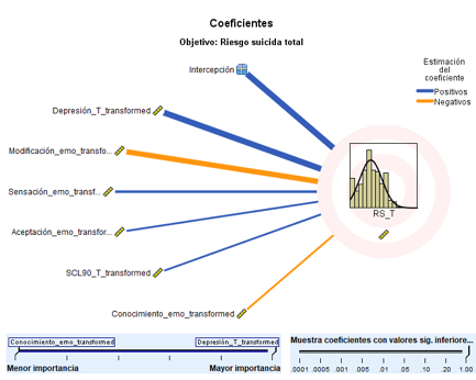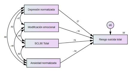 Aunado a lo anterior, se realizó un modelo de regresión múltiple automatizado para predecir el riesgo suicida (Figura 1). En él se observa que la presencia de sintomatología depresiva, el reconocer fisiológicamente las emociones, aceptarlas y tener sintomatología clínica, así como las deficiencias en modificar y conocer sus emociones, predicen un 57% el riesgo suicida.