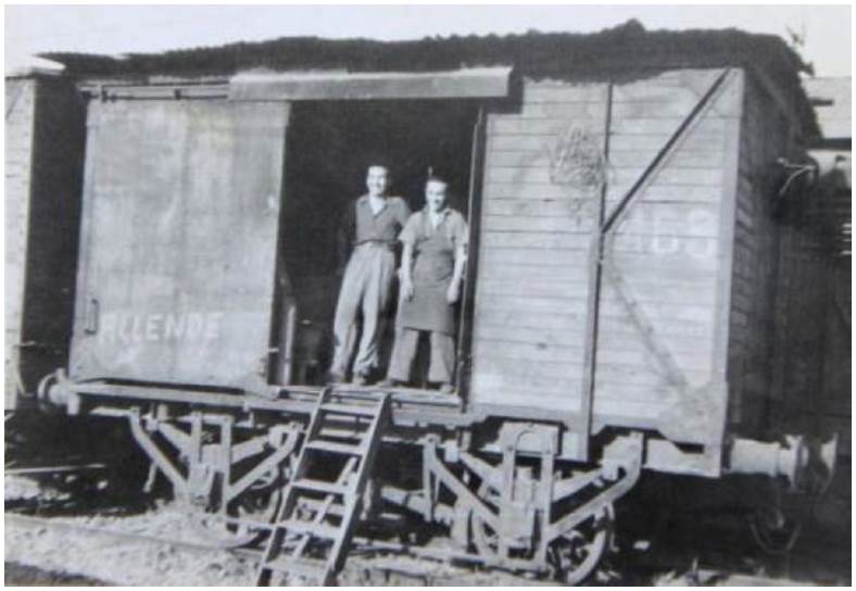 Figura 10 Obreros de Fraternal Ferroviaria en su carro-taller rayado con “Allende” durante la dictadura en 1978