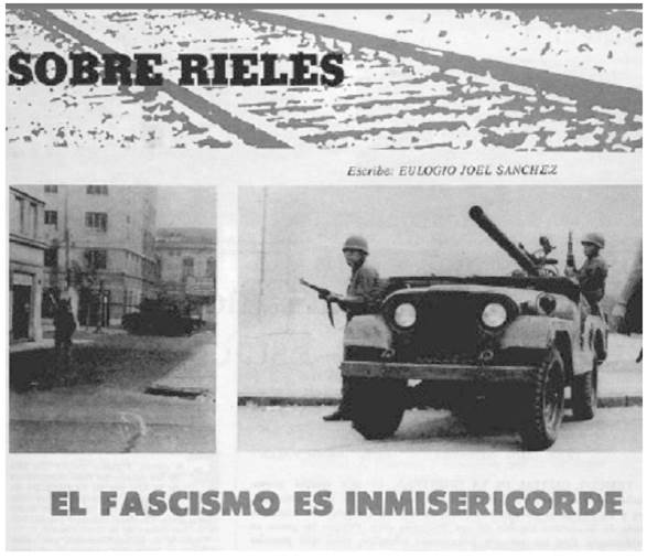 Durante la dictadura, el gremio ferroviario fue reprimido dado que estaban organizados políticamente y en su mayoría militaban en partidos de izquierda y en la Unidad Popular (Sepúlveda, 1959; Sánchez, 1973; Fontaine et al., 2003). Esta tendencia política se revela en una columna escrita por un trabajador de Ferrocarriles en 1973 quien, previamente al golpe de Estado, denuncia violencia por parte de “hordas fascistas” hacia infraestructura y coches de Ferrocarriles del Estado (Figura 9): “Se trata sólo de ser humano que ama la vida y a sus semejantes y a su patria, para condenar al fascismo. Para maldecirlo hoy, mañana y ante el porvenir de los hombres libres de nuestro Chile” (Sánchez, 1973, p. 9).