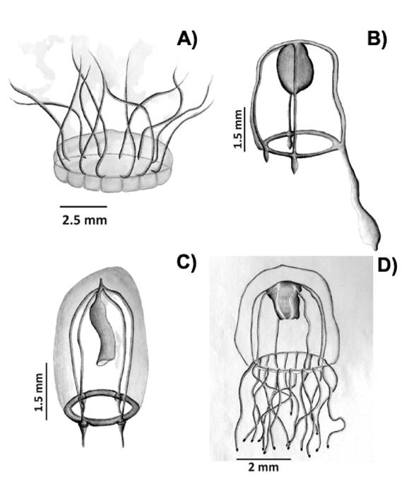 En Solmaris flavescens, S. tubulosa, P. minor, P. quadrata y S. incisa solo se encontraron ejemplares en estadios juveniles que coinciden con las descripciones de Russell (1953), Kramp (1965,1968), Bouillon (1999), Bouillon et al. (2004) y Schuchert (2007); en estas especies el número de individuos fue escaso por lo que realizar colectas a mayor profundidad y en periodos más largos pueden aportar más datos útiles para avanzar en el conocimiento de su taxonomía.