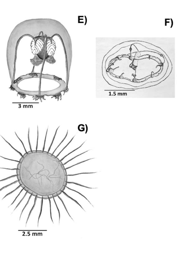Figura 3 Hidromedusas en Bahía de Banderas, Jalisco-Nayarit. E) Koellikerina fasciculata (Péron & Lesueur, 1810), modificado de Schuchert (2007). F) Phialella quadrata (Forbes, 1848) juvenil, modificado de Russell (1953). G) Solmissus incisa (Fewkes, 1886) juvenil.