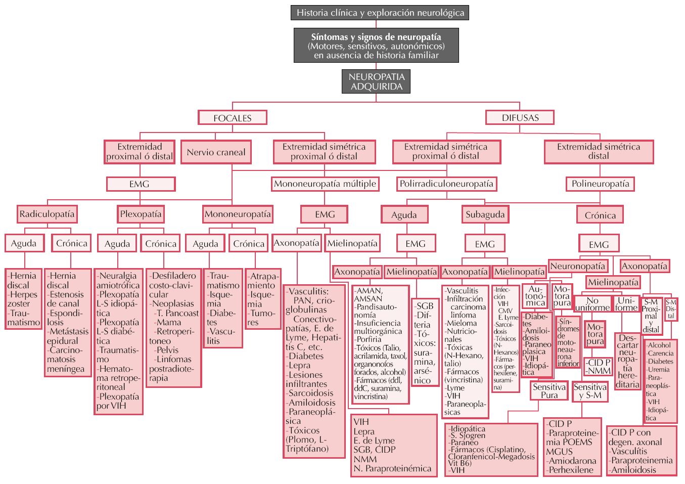 El grupo de estudio de enfermedades neuromusculares de la Sociedad Española de Neurología propone un esquema de diagnóstico diferencial de estas enfermedades,20 que puede verse en el Cuadro 2. Los síntomas y signos que conforman el diagnóstico sindrómático de neuropatía periférica, en ausencia de historia familiar, orienta hacia una neuropatía periférica adquirida. Después de haber establecido este diagnóstico sindrómático debe perfilarse su distribución topográfica, diferenciando entre formas focales y difusas. Éstas, a su vez, tienen diferentes patrones, según la afectación sea distal o proimal, simétrica o asimétrica, lo que permitirá situar la lesión dentro del sistema nervioso periférico en forma de radiculopatía, plexopatía, mononeuropatía, mononeuropatía múltiple, polirradiculoneuropatía o polineuropatía. La diferenciación entre lesiones agudas (menos de cuatro semanas), subagudas (entre cuatro y ocho semanas) y crónicas (más de 8 semanas) permite distinguir entre distintos procesos etiológicos. El estudio electromiográfico es imprescindible en la valoración de todo paciente con sospecha clínica de neuropatía periférica, y permite diferenciar entre lesiones axonales (axonopatías), desmielinizantes (mielinopatías), y neuronopatías (motoras o sensitivas), lo que será de gran relevancia para el diagnóstico etiológico.20
