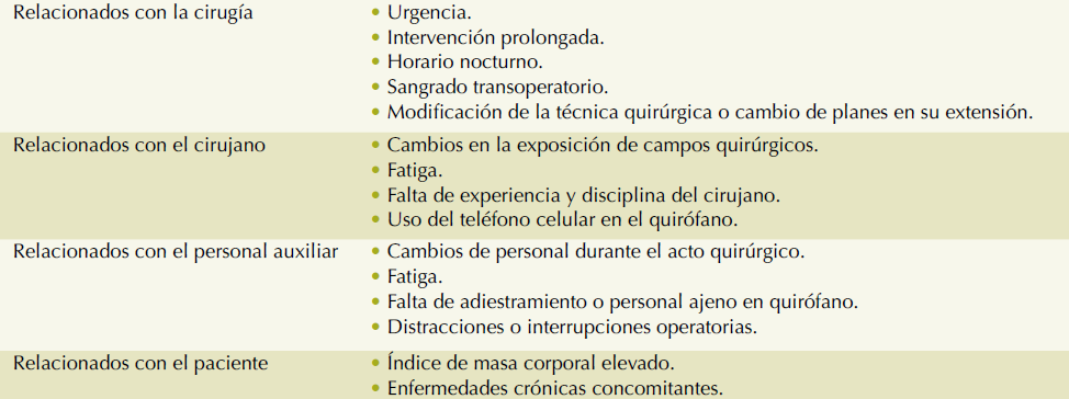 El estudio de Gawande, efectuado en Estados Unidos con 54 pacientes, reportó como principales factores de riesgo para objetos extraños retenidos: procedimientos quirúrgicos de urgencia, cambios en la técnica quirúrgica e índice de masa corporal elevado. Estos factores se confirmaron, recientemente, en el estudio de Stawicki (retrospectivo, multicéntrico, de casos y controles), efectuado en cinco hospitales de Estados Unidos, quien además de los factores citados agregó: eventos quirúrgicos inesperados y complicaciones intraoperatorias.19-20