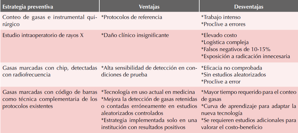 Cuadro 2 Ventajas y desventajas de las estrategias para prevenir el olvido de objetos extraños.