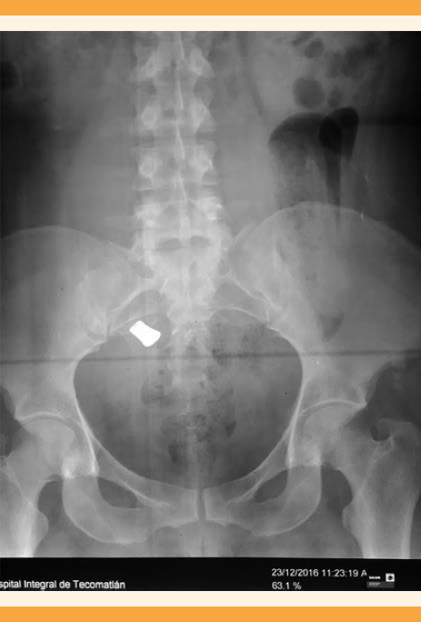 Paciente de 27 años de edad, con un cuerpo extraño retenido en la cavidad abdominal (bulbo de la cánula de Yankauer), olvidado durante una cesárea de urgencia. El diagnóstico y tratamiento fueron expeditos, con reintervención quirúrgica para extraer el cuerpo extraño, sin complicaciones y con evolución satisfactoria de la paciente.