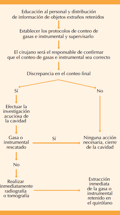 El conteo de gasas correcto sugiere la mejor medida de prevención. El Colegio Americano de Cirujanos, en conjunto con la Asociación de Enfermeras Quirúrgicas de Estados Unidos,52-53 establecieron las guías para el conteo de gasas, que debe realizarse de la siguiente manera: