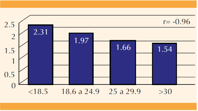 Figura 1 Correlación entre IMC y concentración de progesterona el día de la aplicación de hCG. (r=-0.96).