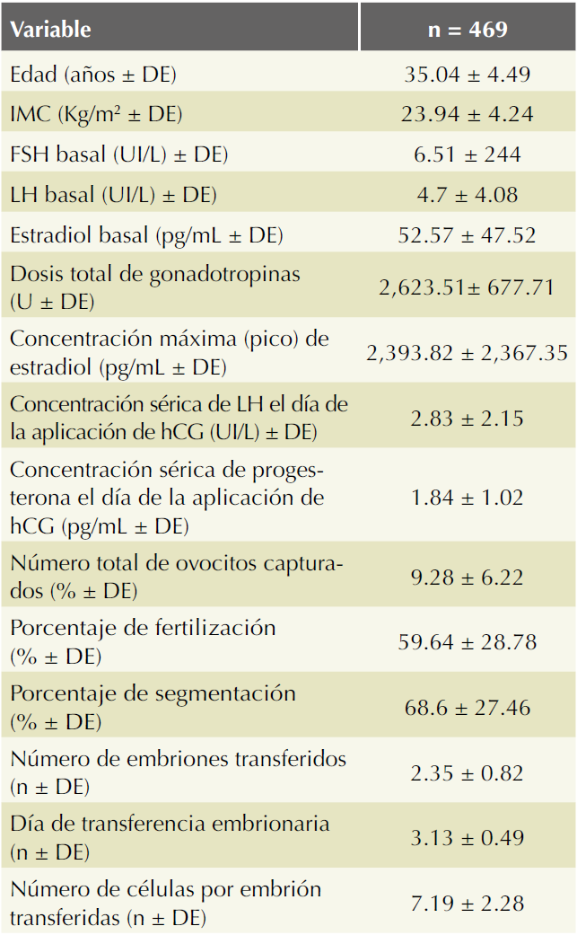 Durante el periodo de estudio se analizaron 469 ciclos de fertilización in vitro. Los datos demográficos de la población de estudio se muestran en el Cuadro 1.