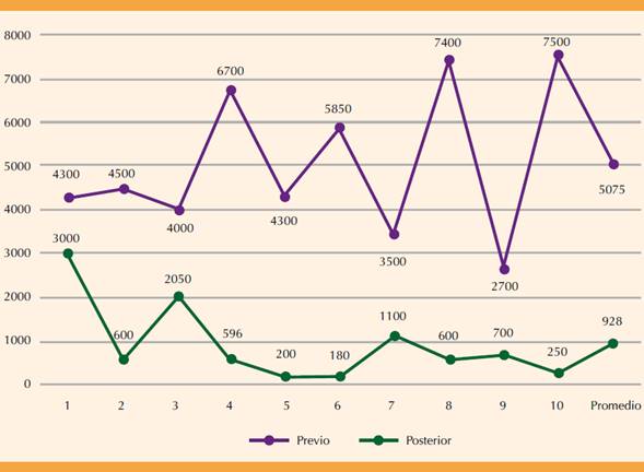 La cuantificación del sangrado promedio previo a la administración de rFVIIa fue de 5075 mL y posterior a la última dosis de rFVIIa de 928 mL. Cuadro 2 y Figura 1