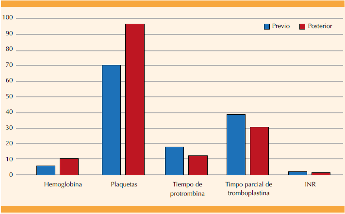 En promedio, se administraron siete concentrados eritrocitarios antes de la administración de rFVIIa y tres después. El resto de hemoderivados trasfundidos, y sus promedios, se consignan en el Cuadro 2 y Figura 2. Los parámetros hematológicos promedio, previos a la administración del rFVIIa y 24 horas posterior a ésta, se señalan en el Cuadro 3 y Figura 3.