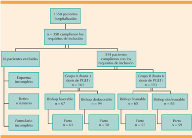 Se analizaron 1350 pacientes de las que se excluyeron 350 que no cumplieron con los criterios de inclusión. De estas últimas, 36 no se consideraron aptas para el estudio debido a varias razones. Al final, se estudiaron 314 pacientes (grupo A: 3 dosis [n = 161]; grupo B: 6 dosis [n = 153]), lo que cumplió con el cálculo original de la muestra (Figura 1). Las características basales de la población fueron similares en ambos grupos (Cuadro 1) con respecto a las variables reportadas. Al momento de su admisión todas las pacientes tuvieron índices de Bishop desfavorables.
