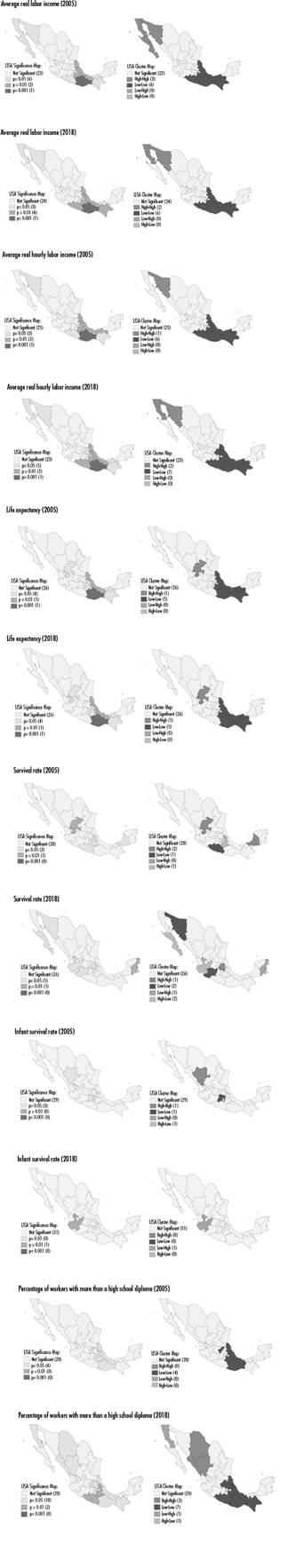 Figure 2 shows that high labor income values are concentrated in the country’s northwest, i.e., Baja California and Sonora. In contrast, low labor income values are focused on the country’s southeast, i.e., Chiapas, Guerrero, Puebla, Oaxaca, and Veracruz. Furthermore, it is observed that this spatial pattern remained relatively the same from 2005 to 2008. The highest life expectancy is concentrated in Zacatecas, while the lowest is concentrated in Chiapas, Puebla, and Veracruz, both for 2005 and 2018. Survival and infant survival rates show the most significant variation between 2005 and 2018. Finally, a concentration of low percentages of workers with more than a high school diploma is observed in the southeast of the country, particularly in the states of Chiapas, Puebla, and Veracruz. A concentration of high percentages of workers with more than a high school diploma was observed in the states of Chihuahua, Durang,o and Sinaloa in 2018.