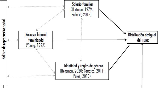 Dentro de la literatura marxista-feminista (de carácter predominantemente teórico) se han discutido varios factores que inciden sobre una mayor o menor desigualdad en la distribución del TDNR entre hombres y mujeres. Así, de acuerdo a Hartmann (1979), el salario familiar -asociado al rol de sexo del obrero hombre como único proveedor monetario del hogar- es el principal determinante en la desigual distribución del TDNR, postura también compartida por Federici et al. (2018). Por su parte, Young (1992) insiste en que la división sexual del trabajo -y la feminización del TDNR- estaría asociada, a su vez, con la necesidad del capitalismo de encontrar un criterio de segmentación de la fuerza de trabajo. En consecuencia, esta autora vincula la feminización del TDNR con una reserva laboral feminizada (ejército industrial de reserva). Por su parte, para Hensman (2020), Carrasco (2011) y Pérez (2019), la desigual distribución del TDNR se explicaría principalmente por las identidades de género construidas a partir de diferentes procesos de socialización de niños y niñas, en la cual se van construyendo distintos roles y relaciones de género.