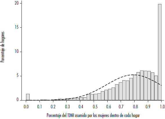 En primer lugar, llama la atención que de los 7 471 hogares obreros mexicanos de la muestra 8% no contaba con mujeres. Para el restante 91.9% de los hogares (con al menos una mujer), la Figura 2 muestra su distribución de acuerdo con el porcentaje de TDNR realizado por las mujeres (la línea punteada corresponde a la aproximación normal de dicha distribución). Se puede observar que apenas en 8.3% de los hogares obreros mexicanos las mujeres asumían 50% o menos de la carga del TDNR. En todos los demás hogares obreros las mujeres asumían más de la mitad del mismo. De hecho, la mediana de la distribución fue de 83.7%. Eso significa que en la mitad de los hogares obreros las mujeres asumían más del 83.7% de la carga del TDNR. Esto se observa claramente en el sesgo negativo de la distribución (véase Figura 2).