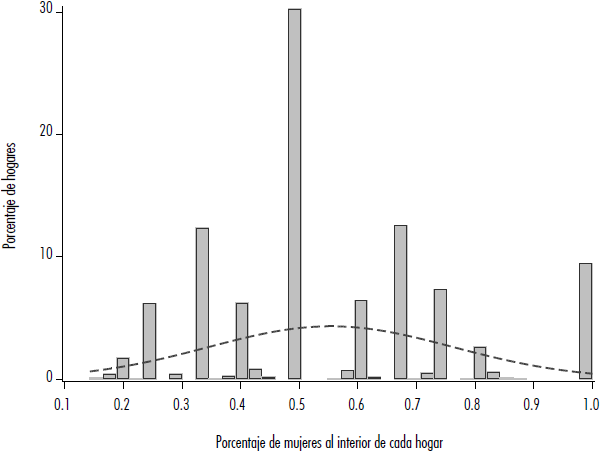 Una implicación de los anteriores resultados es que la participación porcentual de las mujeres en el TDNR al interior de cada hogar es un indicador insuficiente para dar cuenta de la desigualdad de sexo en la distribución del mismo. Este punto se puede ilustrar con un ejemplo numérico: si se considera un hogar donde las mujeres realizan aproximadamente 50% del TDNR, a simple vista, este hogar se podría clasificar como equitativo en la distribución por sexo del TDNR. Sin embargo, dicha interpretación sólo sería válida si las mujeres representaran también la mitad de los miembros del hogar. Por el contrario, si -siguiendo con el ejemplo- sólo representaran el 30%, entonces estarían sobrerrepresentadas en la carga de TDNR. En comparación, los hombres de dicho hogar asumirían la mitad del TDNR, pero representan el 70% de las personas del hogar. Están, pues, subrepresentados, en una situación claramente desigual y desfavorable para las mujeres de dicho hogar.