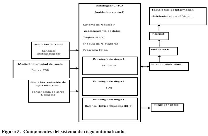 La integración de información (meteorológica, cultivo, suelo, geográfica y algoritmos), hardware y software interactuaron de acuerdo a lo programado dentro del sistema de riego, lo que permitió el correcto manejo y control, de las tres estrategias implementadas (lisímetro, TDR y balance hídrico climático). La programación modular y estructurada del programa, permitió la fácil inserción de diversos algoritmos y alimentación de información (meteorológicos, cultivo, suelo, geográficos) necesaria dentro del programa (software), indispensables para la estimación objetiva del riego para el cultivo.