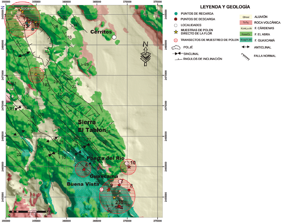 Las principales zonas de recarga de la región se ubican en las sierras, donde la Formación El Abra se encuentra aflorando (Figura 2). Otra posible zona de recarga es la cuenca cerrada de Joya de Luna. La zona de descarga se ubica en las partes bajas al sur de la zona de estudio, en el contacto entre la Formación El Abra y la Formación Guaxcamá (Figura 2). El fracturamiento y las estructuras cársticas (fallas y dolinas) están alineadas con orientación de NW-SE y NE-SW. Es probable que el Socavón de Joya de Luna (1230 m s.n.m.) y las dolinas alineadas estén conectados por cavidades bajo la Sierra El Tablón hasta la zona de descarga en Guaxcamá, la cual tiene una altura de 1112 m s.n.m.; la diferencia de elevación entre ambas localidades de 118 m genera una pérdida de energía experimentada por unidad de longitud recorrida por el agua, es decir, representa la pérdida o cambio de potencial hidráulico por unidad de longitud, una medida que indica el sentido del flujo de agua.