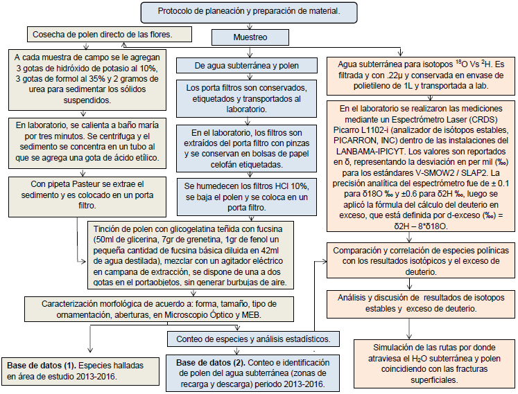 Se realizó la toma de muestras de agua subterránea en dos periodos, el primero abarcó de agosto 2013 a abril 2014 y el segundo se realizó en el mes de junio de 2016. Se tomaron muestras de agua subterránea en 15 sitios del área de estudio sumando en total 135 muestras (5 norias en la zona de recarga en Joya de Luna y 10 manantiales en la zona de descarga en las cercanías de Guaxcamá). Para la toma de muestra y captura de las partículas suspendidas en el agua de las norias y manantiales se sigue el procedimiento de la Figura 3. Después del filtrado de las muestras de agua, el polen presente en ellas quedó retenido en los filtros (0.45μm), los cuales se recuperaron en el laboratorio y fueron conservados en bolsas de papel celofán etiquetadas. Posteriormente se prepararon las muestras en láminas delgadas, se procedió a la identificación y caracterización morfológica del polen (Figura 3 y Suplemento electrónico A2) y finalmente se realizó la comparación de especies de polen con las colectadas directamente de la vegetación (Suplemento electrónico A1). Los resultados de la caracterización morfológica de polen fueron interpretados con un análisis de presencia/ausencia y un análisis de frecuencia de las especies presentes en las zonas de recarga/ descarga, a partir de los cuales se generó una base de datos (Tabla 2).