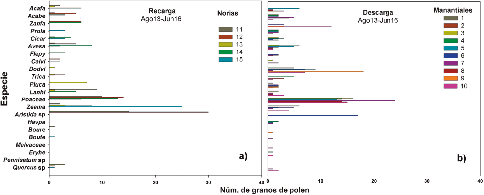 Figura 4 Especies identificadas vs. el número de granos de polen presentes en muestras de agua subterránea colectadas de (a) norias de la zona de recarga y (b) manantiales de la zona de descarga, en el periodo de agosto de 2013 a junio de 2016. Las abreviaturas de los nombres de las especies se definen en la Tabla 2 y la localización de los sitios de muestreo se presenta en las Figuras 1 y 2.